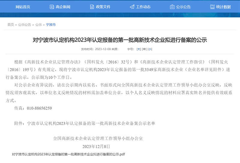热烈祝贺我公司入围2023年认定报备的新一批高新技术企业名单,